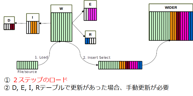 また、非正規化したファクト表へデータをロードするためには、事前にファクト表へデータをロードすることが一般的なため、処理が2ステップになります。