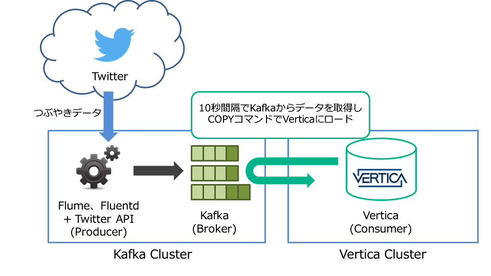 例えばTwitterのつぶやきデータを分析したい場合は、図のような構成で実現することができます。TwitterのつぶやきデータをApache Flumeやfluentdなどを使って収集し、Kafkaに送信します。Kafkaには送られてきたデータがキューとしてKafka Cluster内に次々と溜まっていきます。このキューに溜まっているデータの中から、分析に使用するデータをVerticaが一定間隔(図の場合は10秒間隔)で受け取りに行き、内部的にCOPYコマンドを使ってVerticaにロードします。