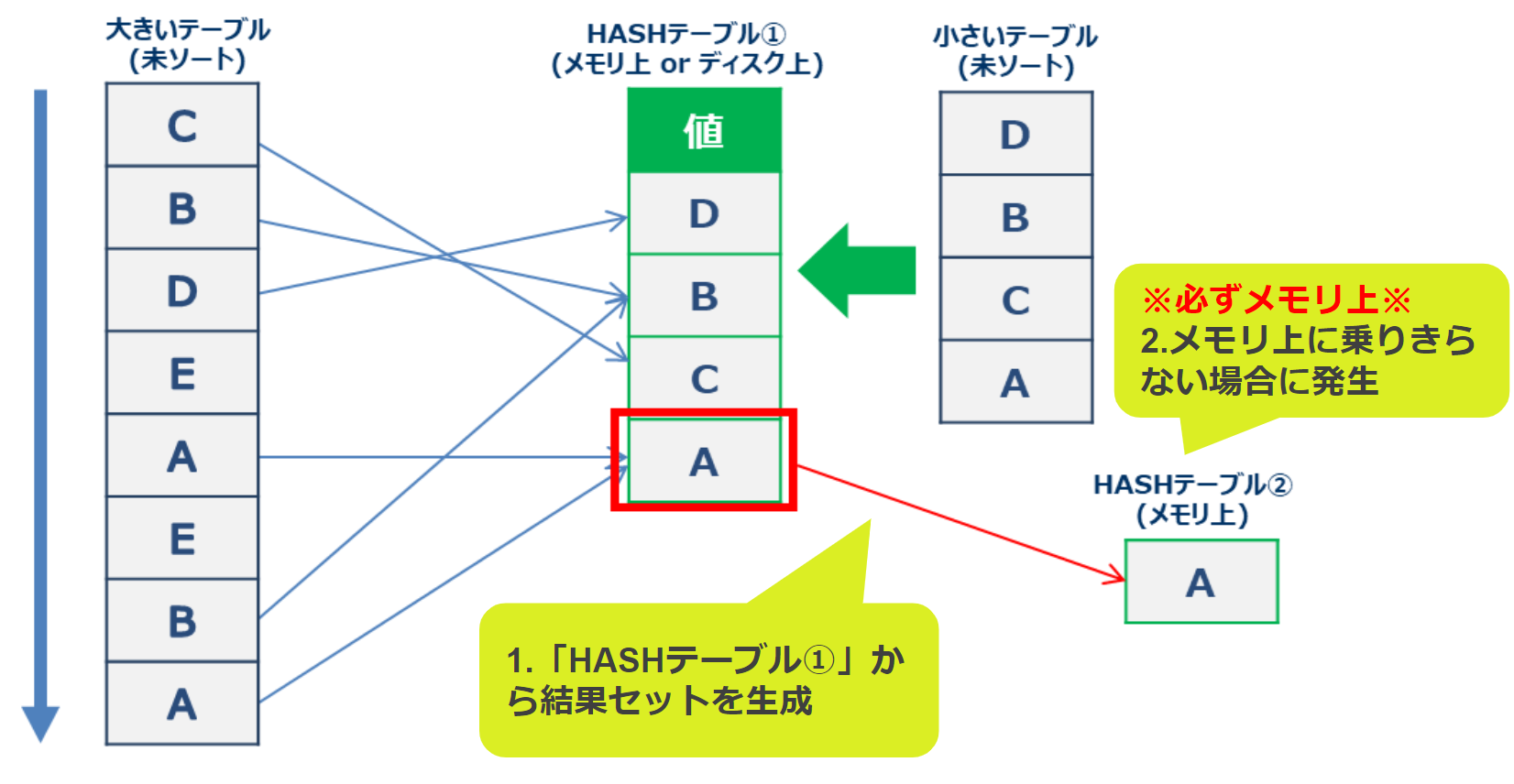 続いて、HASHテーブルを使って結合した結果セット(HASHテーブル②)をメモリ上に作成します。この処理は必ずメモリ上で行われます。メモリ上に乗り切らない場合は、エラーが発生します。