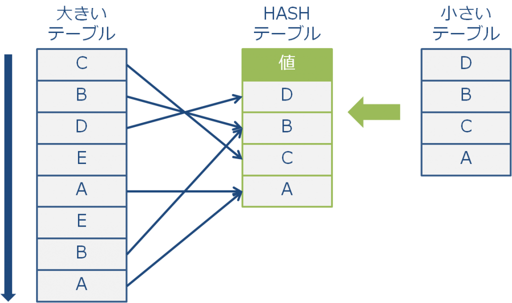 HASH JOINアルゴリズムを使用して、結合する2つのテーブルの内、小さい方のテーブルの結合列をキーとするHASHテーブルを、メモリ上に作成します。