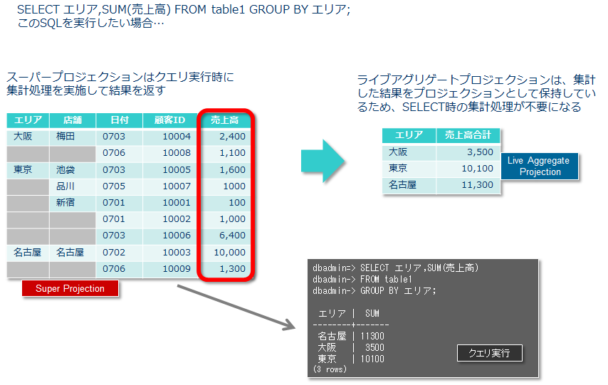 dbadmin-> SELECT エリア,SUM(売上高) AS #プロジェクションの作成に必要なSQLを指定