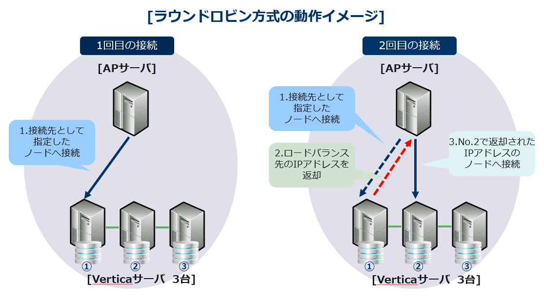 例えば、3ノード構成でラウンドロビン方式を選択した場合は、以下のように動作します。