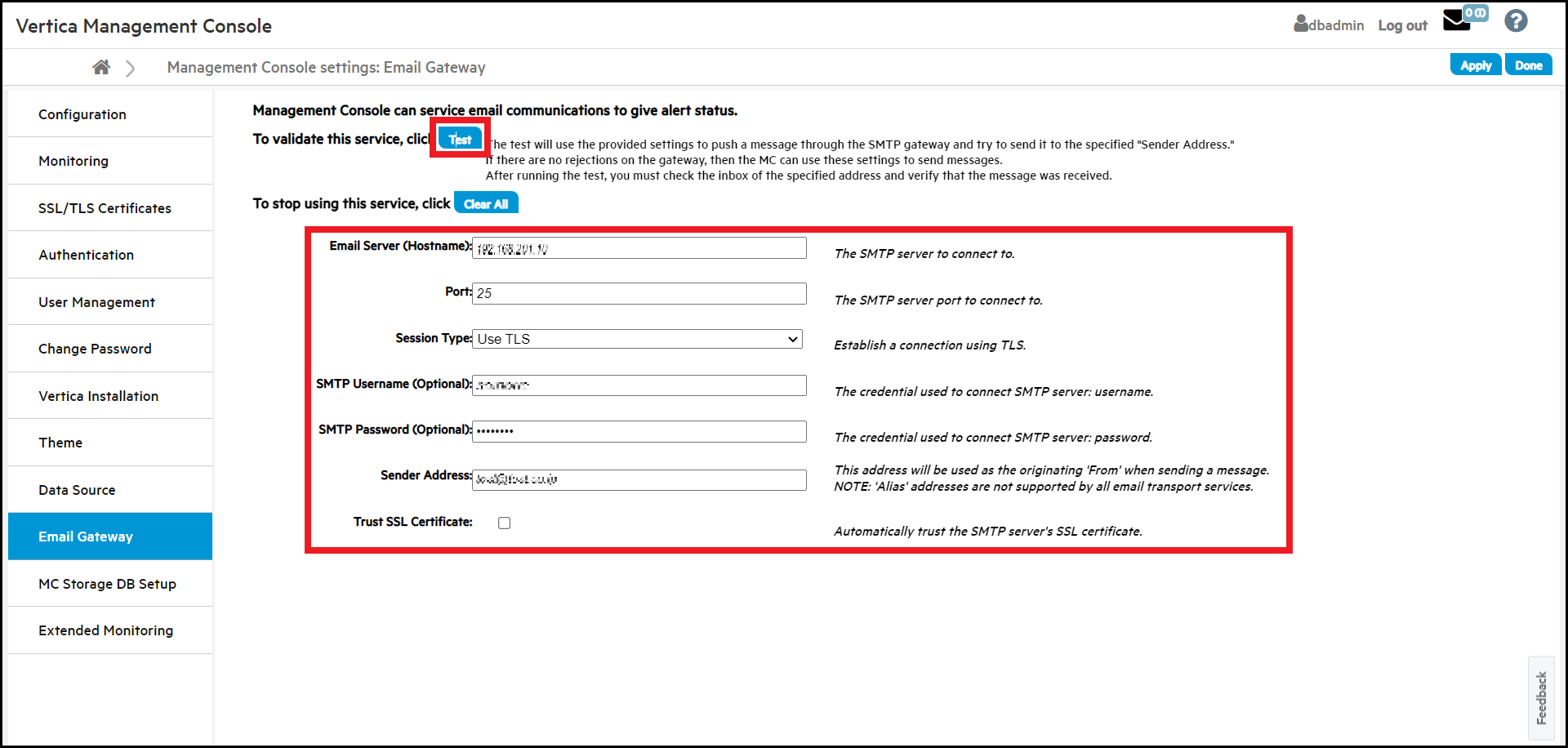 左下にある「Email Gateway」を選択し、SMTPサーバの情報を入力します。入力が完了したら、上部にある「Test」をクリックして、設定内容に問題ないかテストメールを送信します。