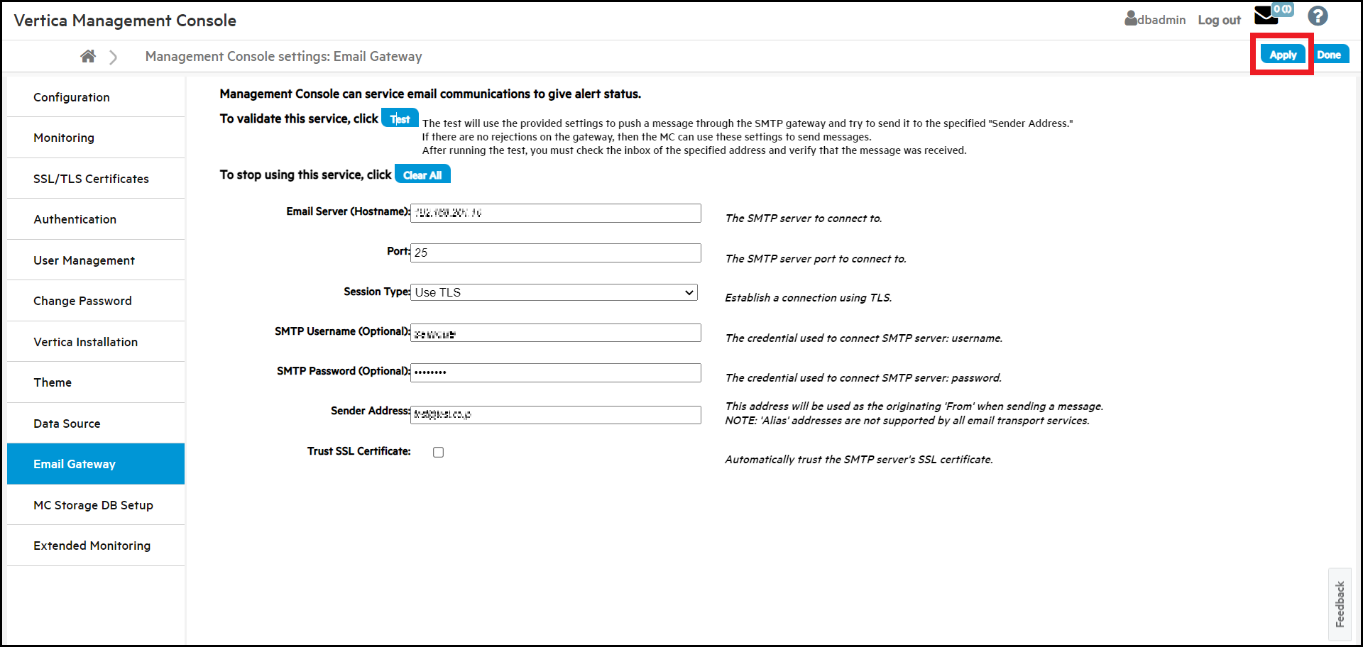 テストメールの受信を確認後、右上にある「Apply」をクリックし、変更内容を確定します。