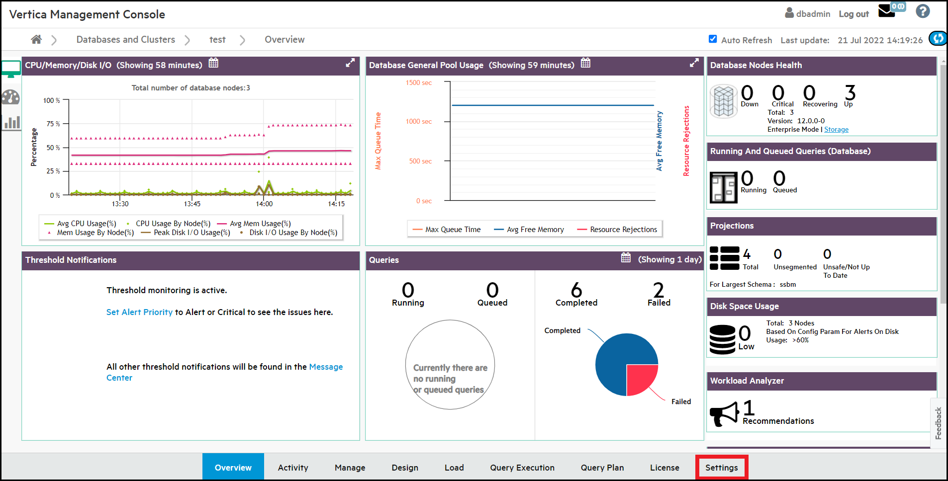 Management Console(以降、MC)は、Verticaや各ノードの稼働状況を監視することができます。監視項目は、CPU、メモリ、ディスク使用率や、クエリ実行時間、ノードダウン検知など、様々な指定ができます。また監視に抵触した場合には、指定のメールアドレスに通知されるため、利用者は障害を早期に発見することができます。