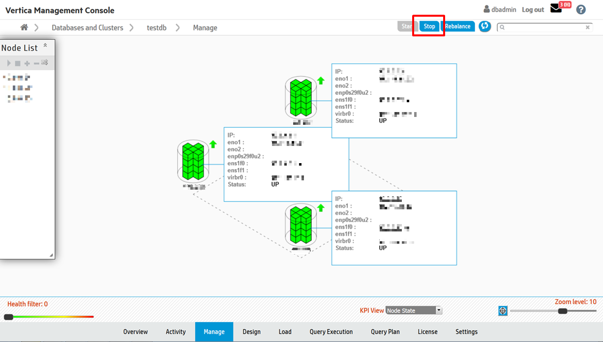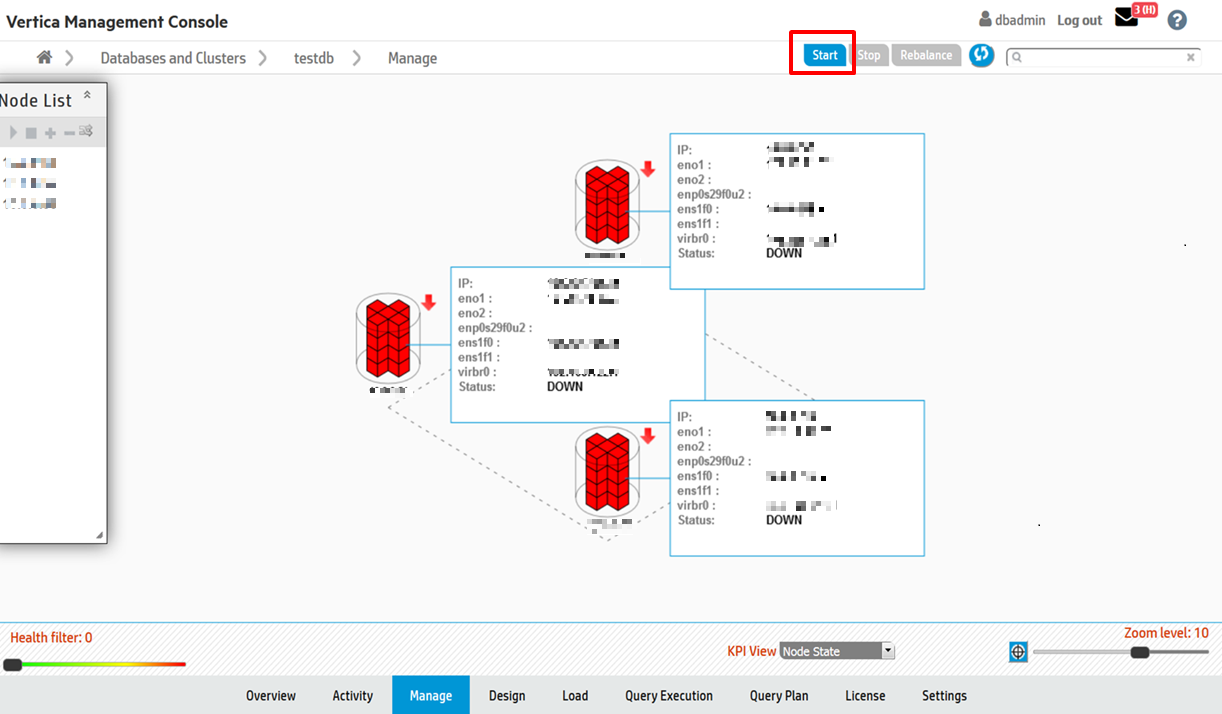 5.各ノードが緑色→赤色に変わり、データベースが停止されました。[Status]が[DOWN]になっていることを確認します。