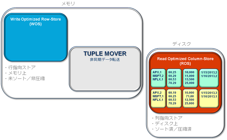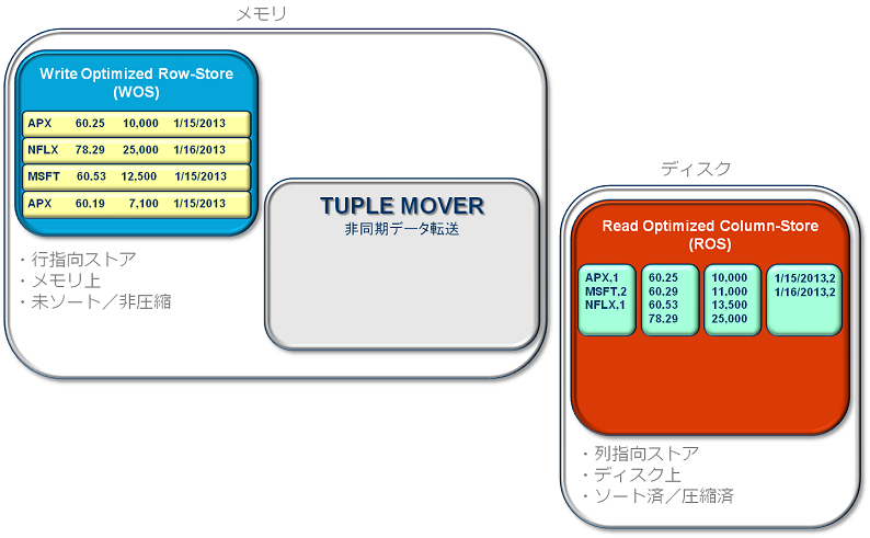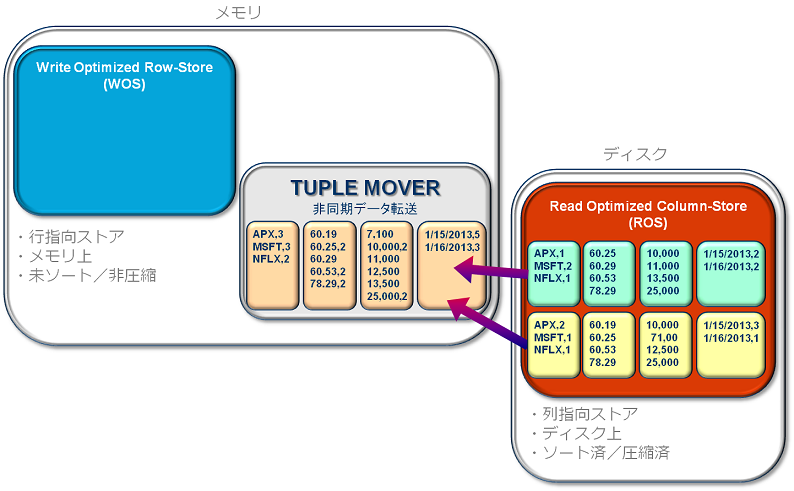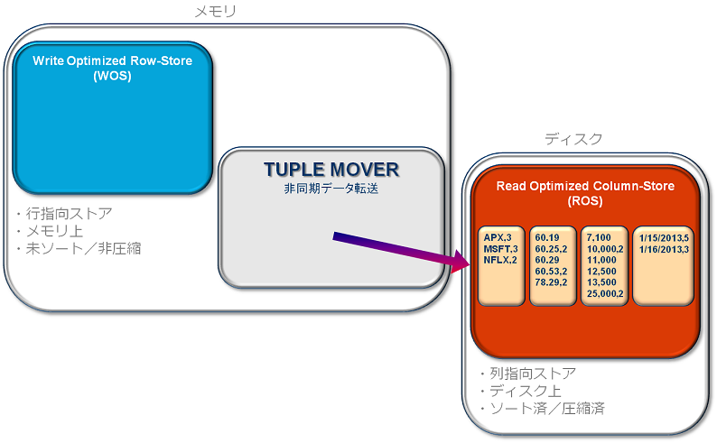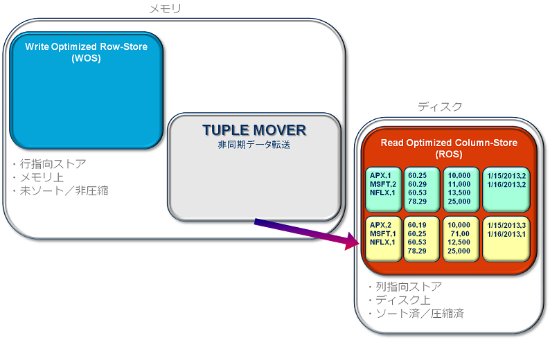 Verticaは、WOS(メモリ)またはROS(ディスク)のどちらかを選択してデータを投入できる、ハイブリッド型データ格納方式となっています。本記事では、WOSとROSそれぞれに格納されたデータが、内部的にどのように移動しているか詳しくご紹介します。