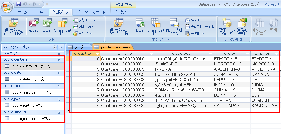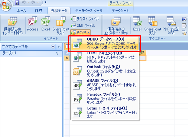 1. [外部データ] > [その他] > [ODBC データベース]を選択します。