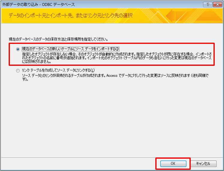 2. [外部データの取り込み]画面より、[現在のデータベースの新しいテーブルにソース データをインポートする]を選択後、[OK]ボタンをクリックします。