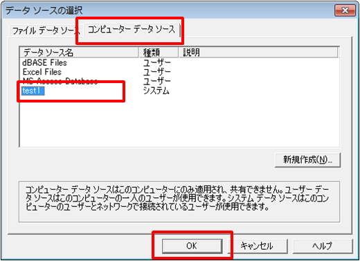 3. [データ ソースの選択]画面より、[コンピューターデータソース]を選択し、「②ODBCの接続設定」で作成した「test1」を選択後、[OK]ボタンをクリックします。