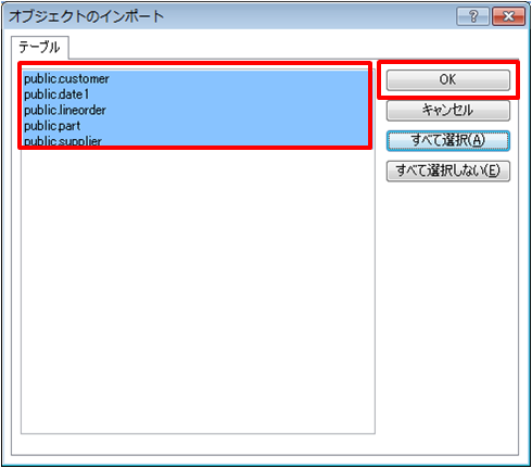 4. [オブジェクトのインポート]画面より、対象のテーブルを選択後、[OK]ボタンをクリックします。