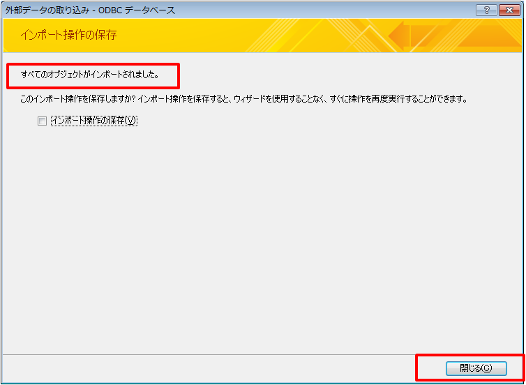 5. [外部データの取り込み]画面で、[すべてのオブジェクトがインポートされました。]の出力を確認後、[閉じる]ボタンをクリックします。
