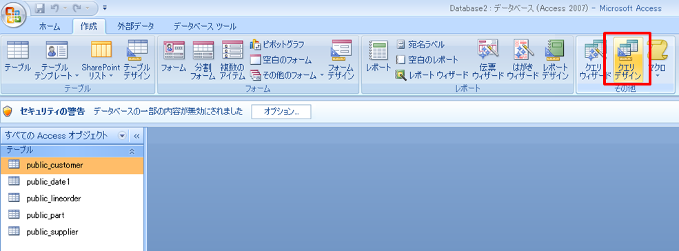 7. 条件を指定し、抽出したいデータだけを取得することもできます。[作成] > [クエリデザイン]を選択します。