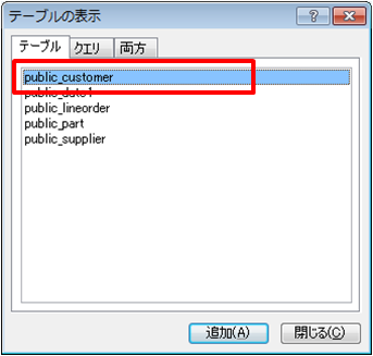 3. [テーブルの追加]画面より、対象のテーブルを選択後、[追加]ボタンをクリックします。