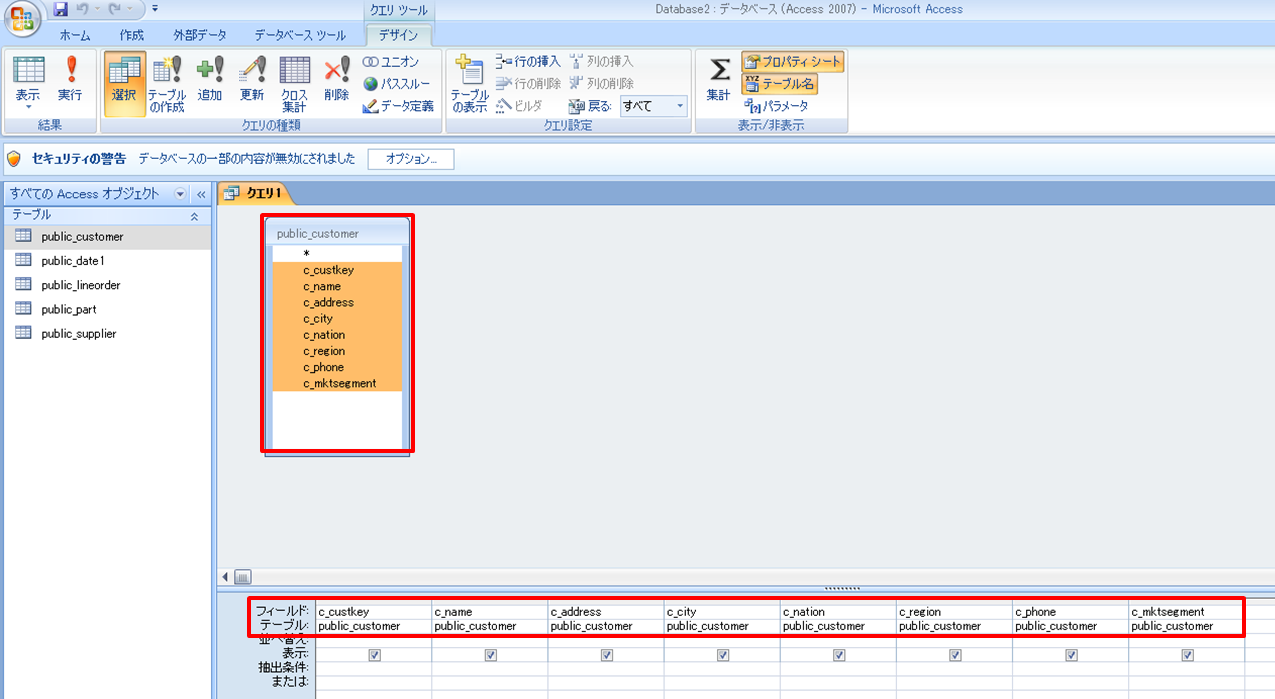 7. 対象のテーブルから、クエリの実行結果に出力したい列を選択します。[抽出条件フィールド]に追加されたことを確認します。