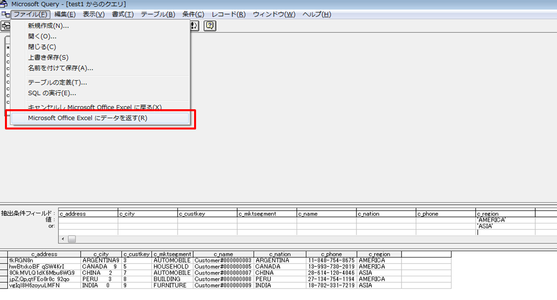 10. 実行結果をExcelに出力します。[ファイル] > [Microsoft Office Excel にデータを返す]を選択します。