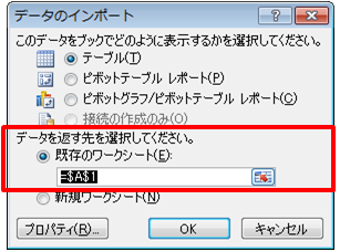 11. [データのインポート]画面で、[データを返す先を選択してください。]より、Excleの出力先を指定します。