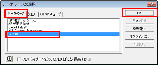 2. [データ ソースの選択]画面より、[データベース]を選択し、「②ODBCの接続設定」で作成した「test1」を選択後、[OK]ボタンをクリックします。