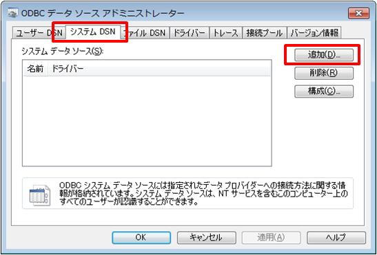 2. [ODBC データソース アドミニストレーター] 画面が表示されるので、[システム DSN]タブを選択し、[追加]ボタンをクリックします。