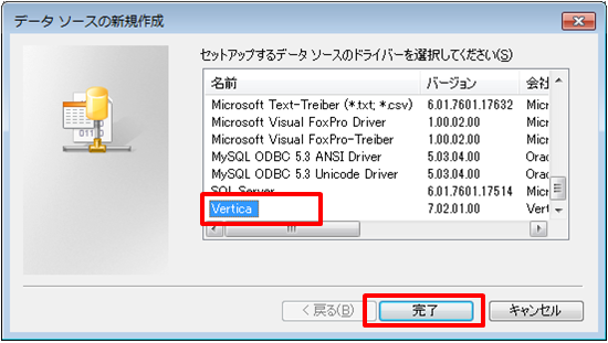 3. [データ ソースの新規作成] 画面より、[Vertica]のドライバを選択し、[完了]ボタンをクリックします。
