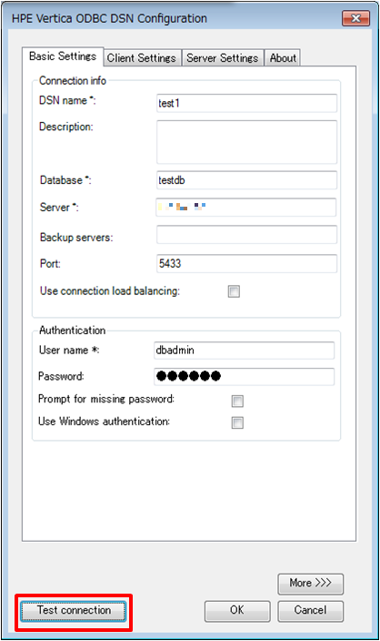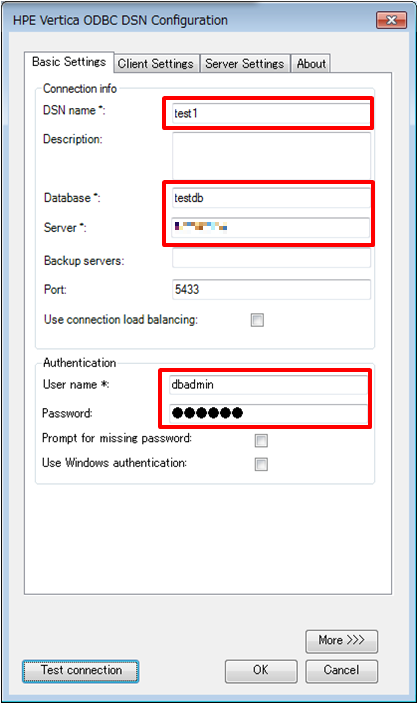 4. [HPE Vertica ODBC DSN Configuration] 画面より、[DSN name]、[Database]、[Server]、[User name]、[Password]を入力します。