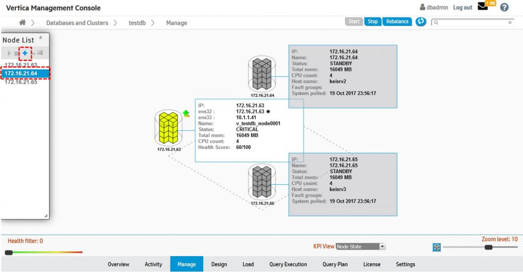 To add or remove hosts, select Cluster Management from the Advanced Menu.Management Consoleの「Manage」画面で追加したIPアドレスの1つを選択して「+」をクリックしノードを追加します。