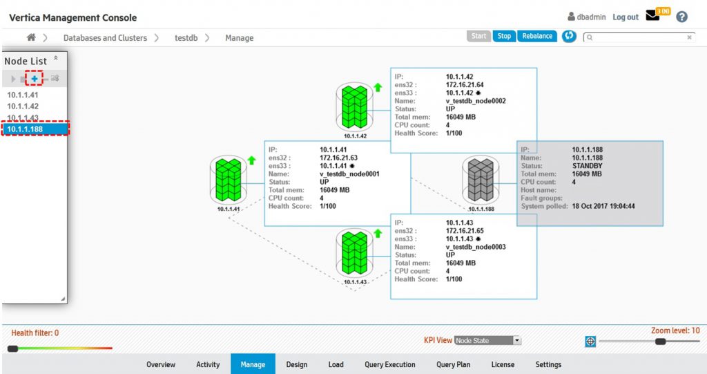 /opt/vertica/sbin/update_vertica --add-hosts 10.1.1.88 --rpm vertica_8.1.x.x86_64.RHEL6.rpm4.クラスタに追加したノードをデータベースに追加します。
