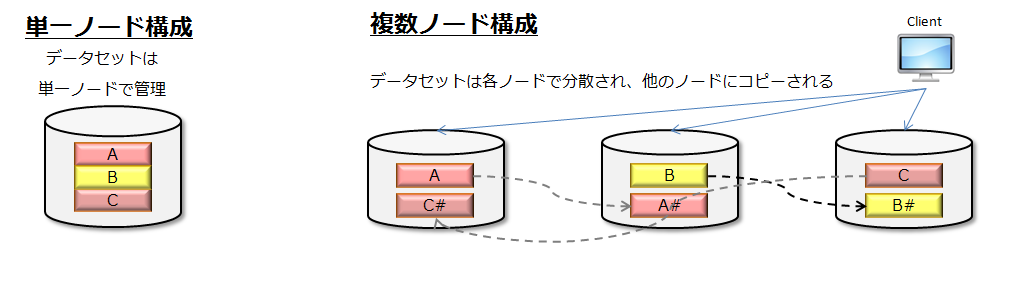複数ノード構成は、単一ノード構成と比較すると下図のように、データを各ノードに分散配置し、