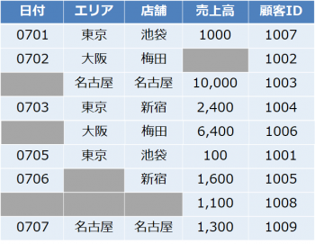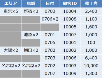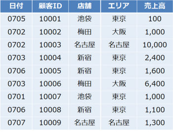 本例では「SELECT COUNT(*) FROM table1 WHERE 日付=’0701’」をクエリとして与えているため日付が最優先でソートされ、その次にエリアと店舗がソートされています。