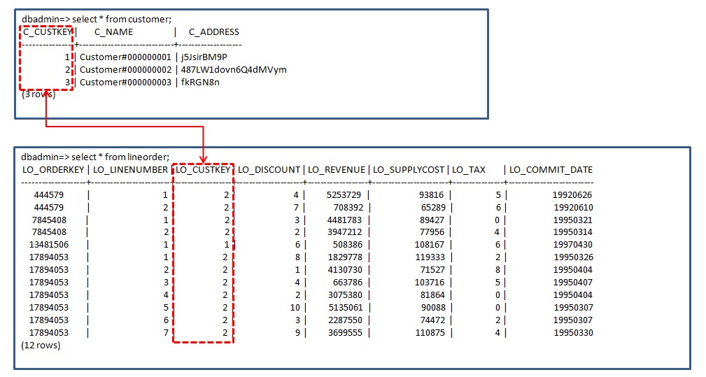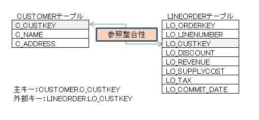 LINEORDERテーブルのLO_CUSTKEY列に参照整合性制約を定義しています。
