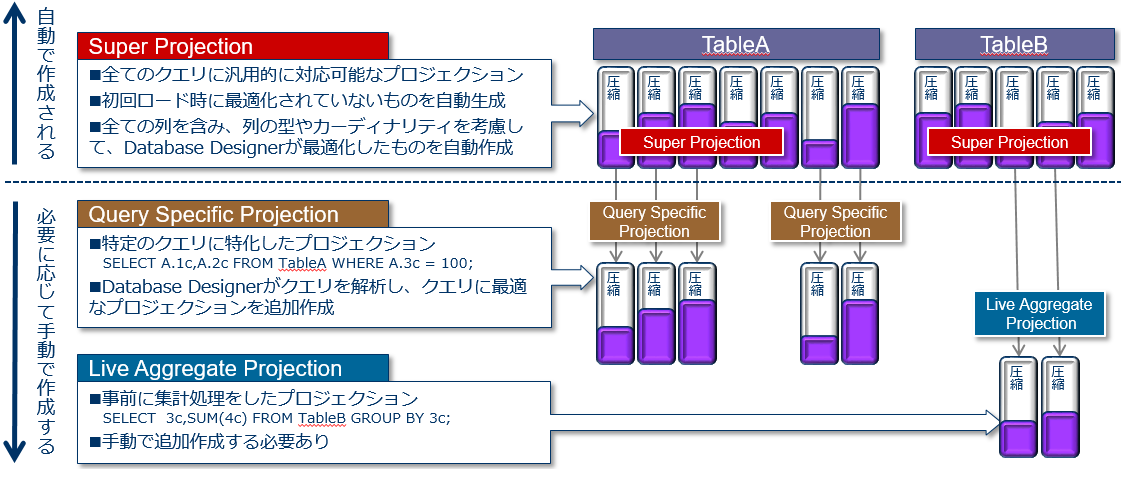 全列のデータを保持しているプロジェクションです。テーブルを作成後にデータをロードするとスーパープロジェクションが1つ作成されます。この状態では、データの最適なソートや圧縮はされていませんが、別途プロジェクションの最適化を行うことで最適なソートや圧縮処理が行われ、最適化されたスーパープロジェクションに作り替えられます。