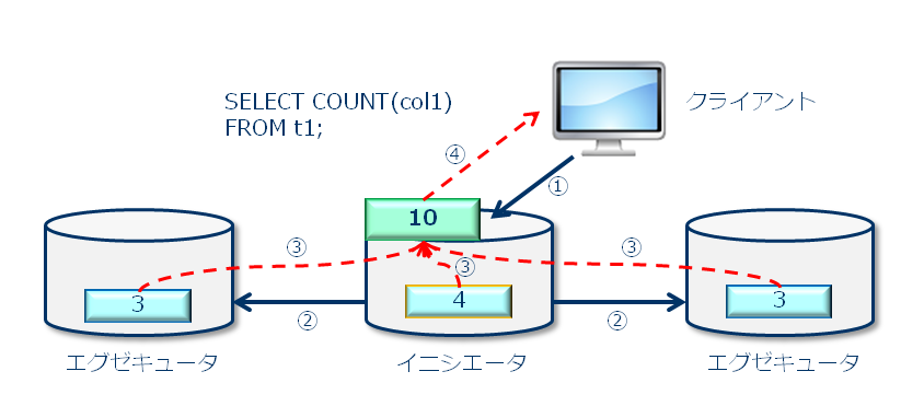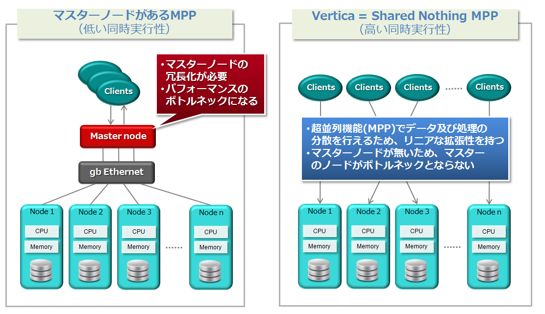 他の製品ではマスターノードが存在するため、同時実行性が低くパフォーマンス面でボトルネックになる傾向があります。しかしVerticaの場合には、マスターノードが無いため、任意の1ノードに接続後にイニシエーターが処理をコントロールします。