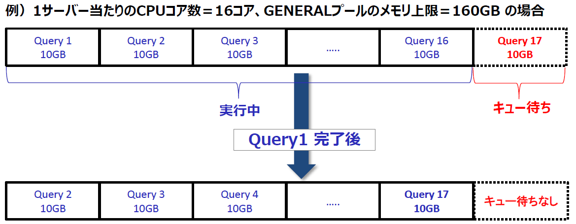 ②CPUコア数を超えたクエリはメモリを割当てることができない。