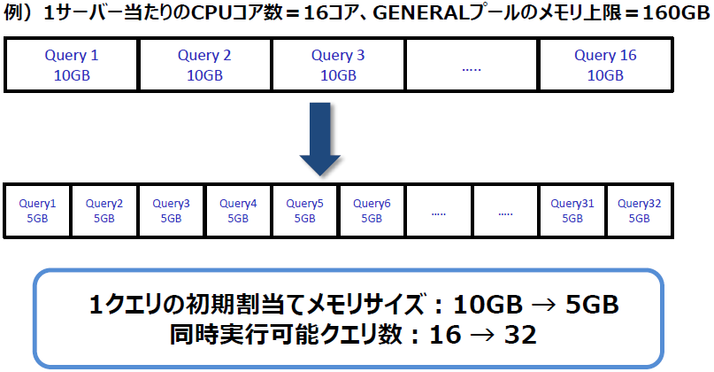 PLANNEDCONCURRENCY | ロングクエリはメモリを多く使用する可能性が高いため、PLANNEDCONCURRENCYの値を小さくし、メモリの初期割り当てサイズを大きくする。これによりメモリの追加割り当てのオーバーヘッドを抑えることができる。 | ショートクエリはロングクエリに比べて必要なメモリが少ない場合が多いため、PLANNEDCONCURRENCYの値を大きくし、メモリの初期割り当てサイズを小さくする。 |