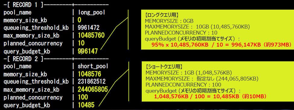 FROM resource_pool_status WHERE pool_name IN('long_pool','short_pool');[実行結果]