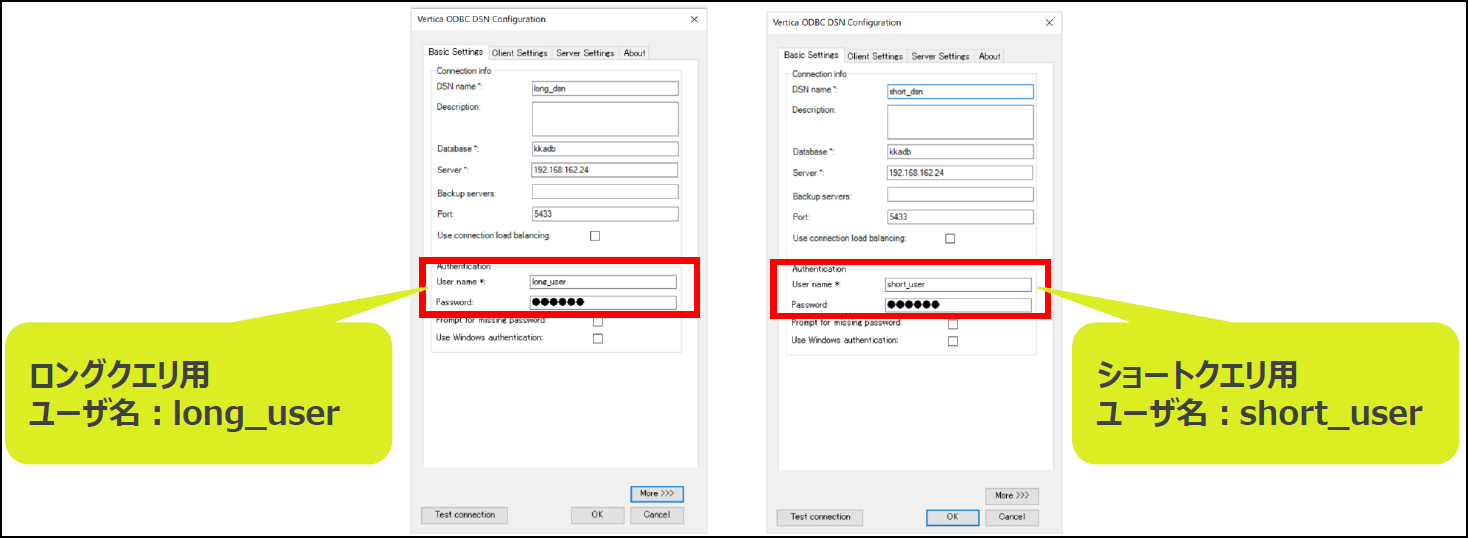 アプリケーションからDBに接続するドライバや接続文字列について、ロングクエリ用とショートクエリ用のユーザをそれぞれ設定します。