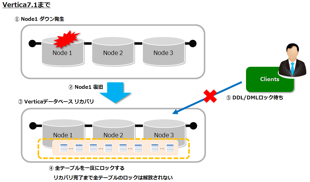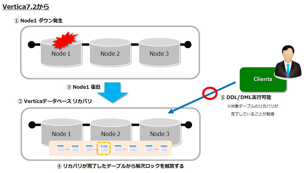 Verticaは複数台構成でノードダウンが発生した場合、ノード復旧後は各ノード間でデータの整合性を保つために、リカバリが実行されます。Vertica7.1までは、リカバリ実行中は全てのテーブルに対して一度にロックをかける動作だったので、DDL/DML(Delete, Update, Merge) は長時間ロックで待たされることがありました。Vertica7.2からは、優先度に従ってテーブル単位でリカバリが実行できるようになったため、リカバリが完了したテーブルから、随時 DDL/DMLを実行できるようになりました。