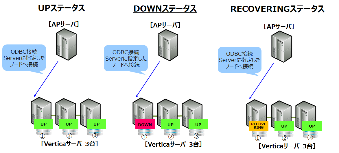 今回はノード1が「UP」、「DOWN」、「RECOVERING」ステータスの時にODBCドライバ経由で接続した時の仕様動作を解説いたします。
