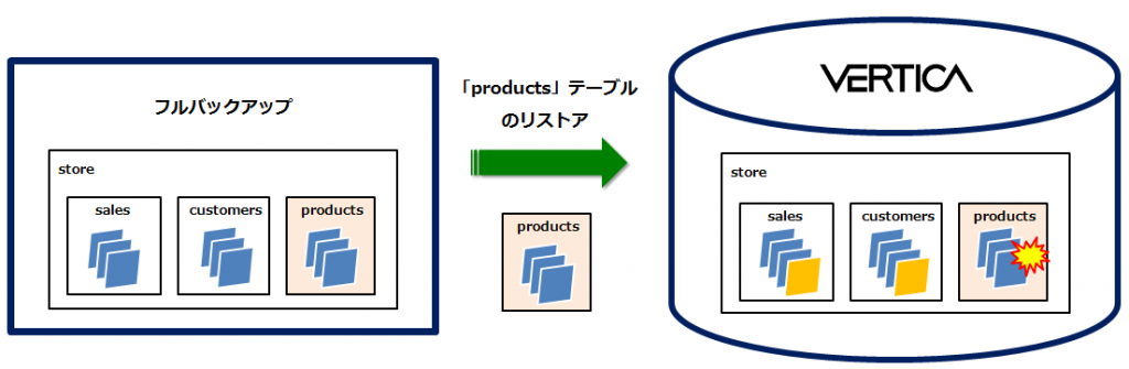 Vertica7.2より、フルバックアップから、指定したオブジェクトのみをリストア可能になりました。データベース全体のリストアは時間がかかる事も考えられるため、テーブルを誤って削除した場合など、特定オブジェクトを復旧したい場合に便利な機能です。指定可能なオブジェクトは、スキーマもしくはテーブルです。
