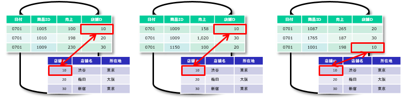 結合処理時に他のノードのデータを参照しなければならないケースが発生します。 例えば、店舗IDが10のデータの結合処理の場合はノード2、3は自身のノードで結合処理を完結できないため、非効率な処理となります。