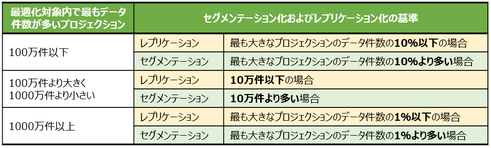 プロジェクションをセグメンテーションおよびレプリケーションする基準