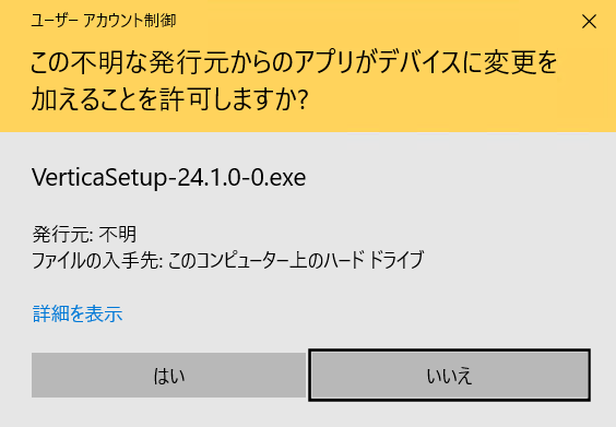 「VerticaSetup-24.1.0-0.exe」ファイルをダブルクリックして実行します。以下のようなセキュリティの警告が表示されたら「実行」ボタンをクリックします。