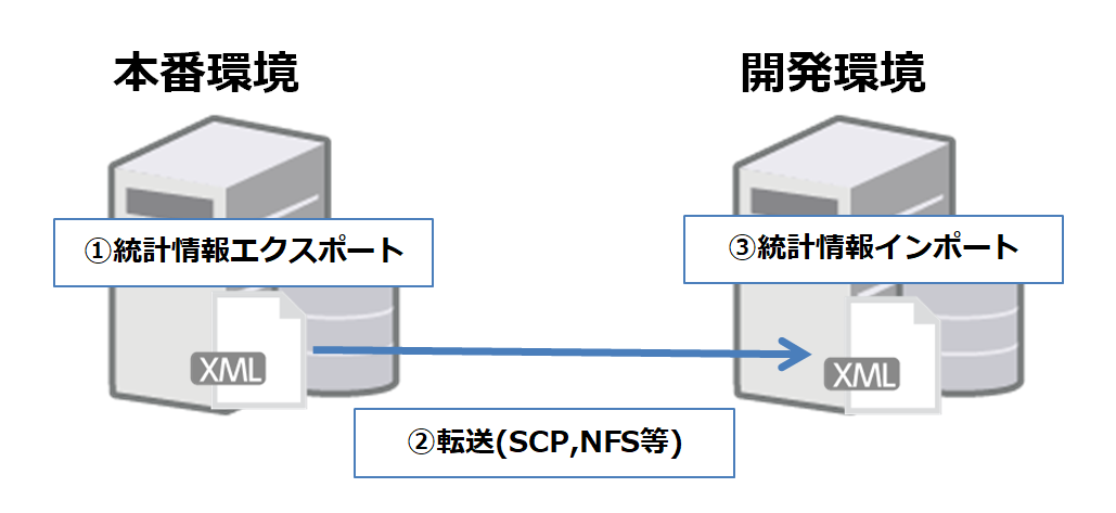 本番環境の統計情報を開発環境にコピーする実行例をご紹介します。