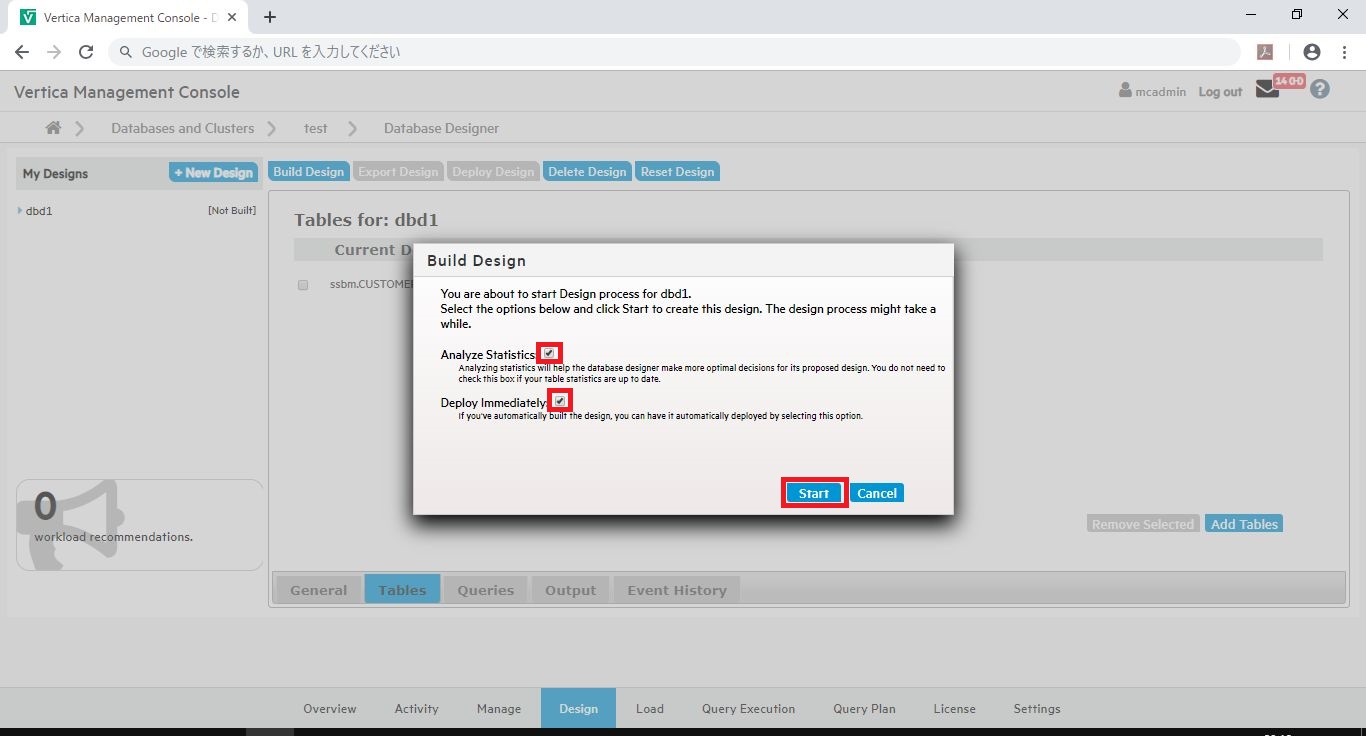 7.プロジェクションを最適化しANALYZEする場合はチェックを入れて、「Start」を選択します。