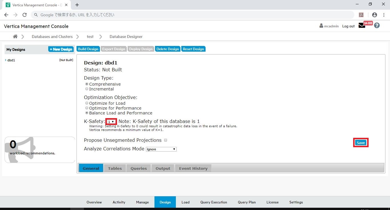 3.複数ノードで構成している場合は、K-Safetyの設定を行い「Save」を選択します。