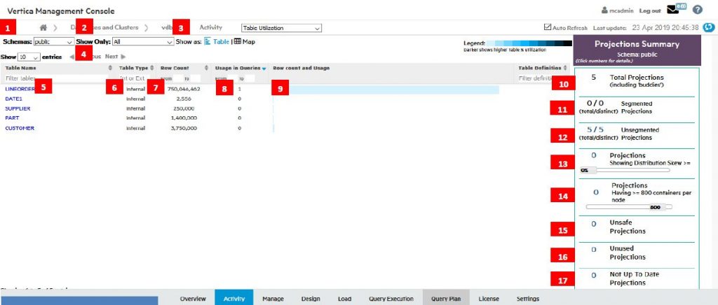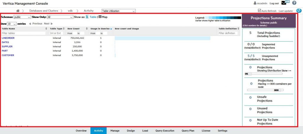 Vertica8.0より、テーブルの件数、サイズ、アクセス状況などのテーブル情報をManagement Consoleで確認することができます。使用率の大きいテーブルやよくアクセスされるテーブルを一目で確認ができ、コマンドを入力して確認する手間が省けるため、データベースの運用管理が容易になります。