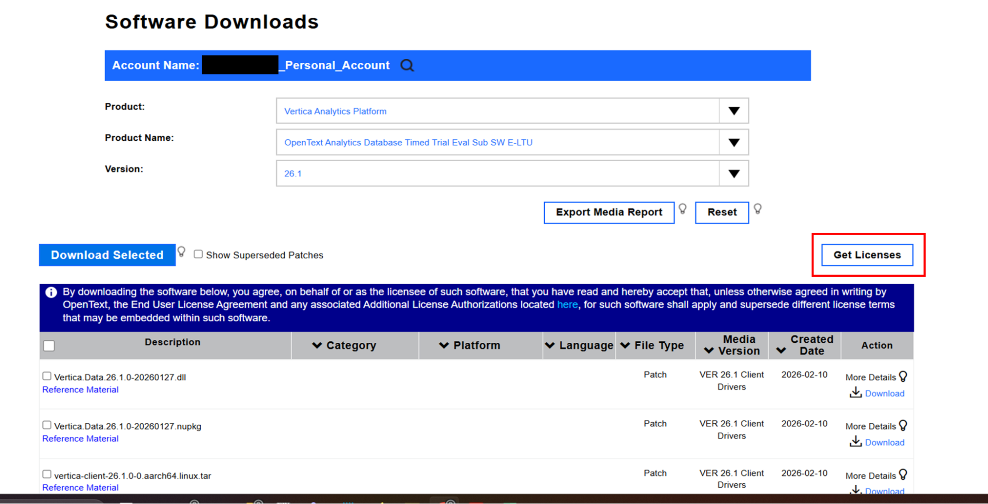 Verticaのソフトウェア(rpm ファイル)ダウンロード画面から、「Get Licenses」を選択します。