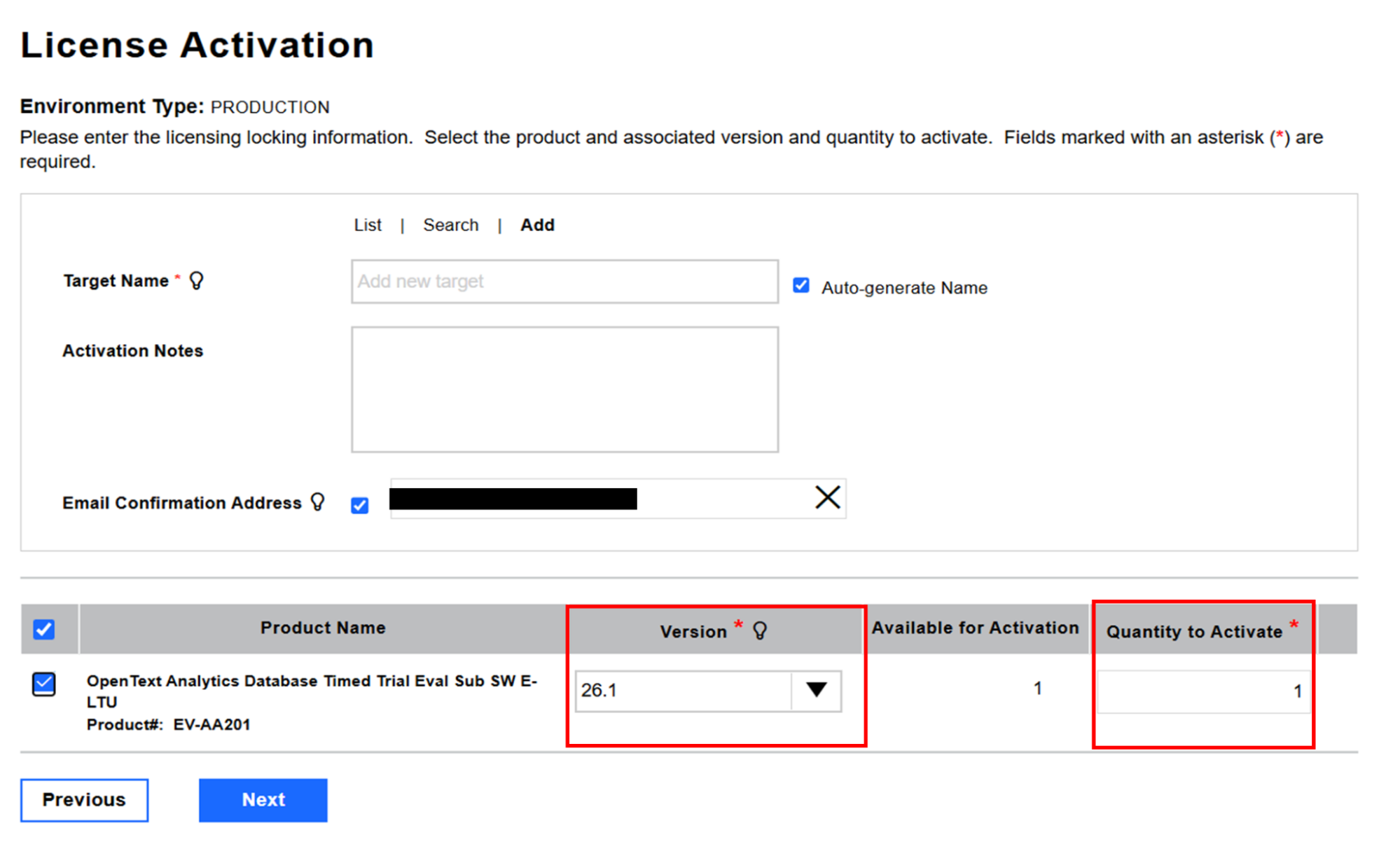 左下のチェックボックスにチェックを入れ、「Version」欄と「Quantity to Activate」欄を入力し、「Next」を選択します。