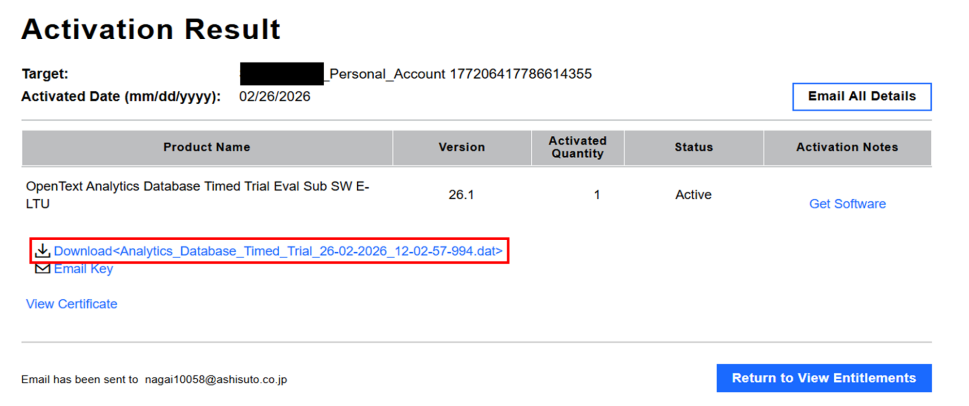 「Status」欄が「Active」になっていることを確認し、画面下部の「Download」からライセンスキーを入手します。