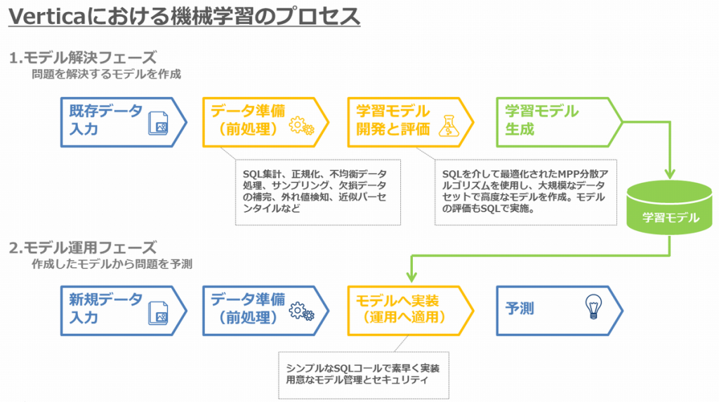 Verticaでは、従来ハードルが高いとされていたこのような機械学習を、以下の図のように標準機能だけで実装しており、一連のプロセスをサポートしています。